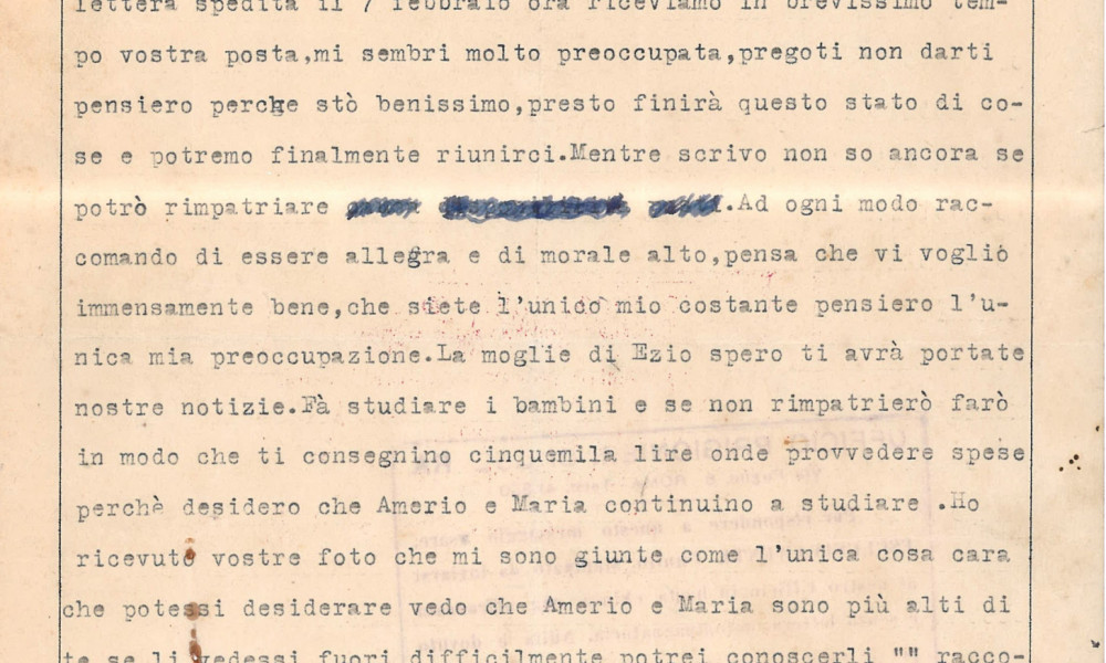 Per concessione speciale possiamo scrivere 200 parole. Ieri ho ricevuto una tua carissima lettera spedita il 7 febbraio ora riceviamo in brevissimo tempo vostra posta, mi sembri molto preoccupata, pregoti non darti pensiero perché stò benissimo, presto finirà questo stato di cose e potremo finalmente riunirci. Mentre scrivo non so ancora se potrò rimpatriare. Ad ogni modo raccomando di essere allegra e di morale alto, pensa che vi voglio immensamente bene, che siete l’unico mio costante pensiero l’unica mia preoccupazione. La moglie di Ezio spero ti avrà portato nostre notizie. Fa studiare i bambini e se non rimpatrierò farò in modo che ti consegnino cinquemila lire onde provvedere spese perché desidero che Amerio e Maria continuino a studiare. Ho ricevute vostre foto che mi sono giunte come l’unica cosa cara che potessi desiderare vedo che Amerio e Maria sono più alti di te se li vedessi fuori difficilmente potrei conoscerli. Raccomando siano buoni. Desidero tanto vedervi, baci e abbracci.