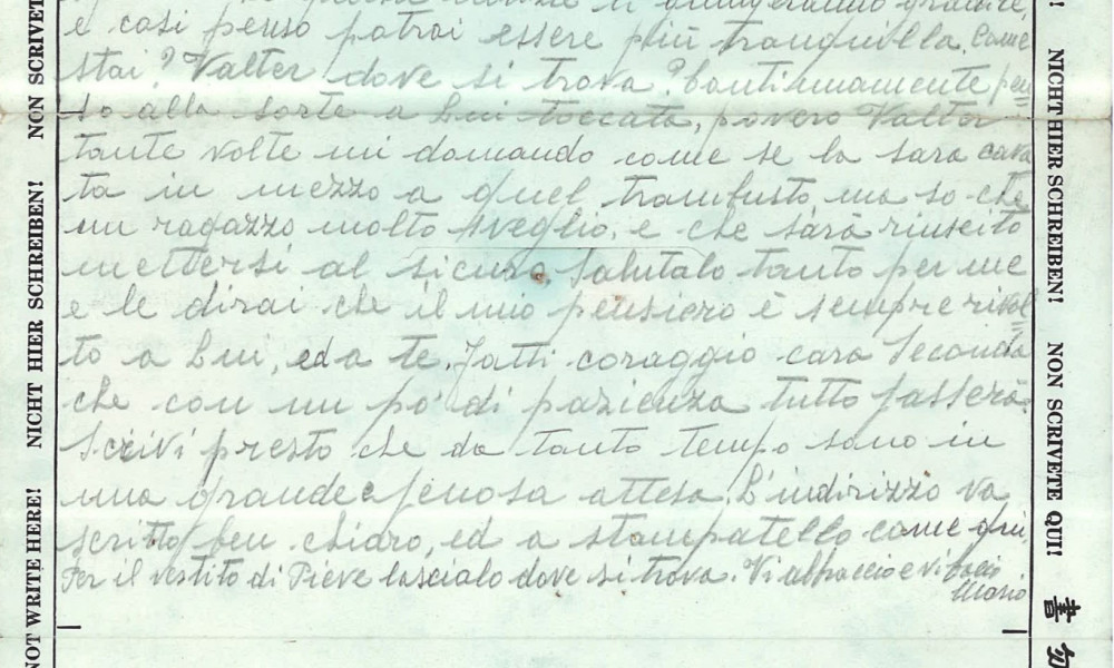 Come stai? Valter dove si trova? Continuamente penso alla sorte a lui toccata, povero Valter tante volte mi domando come se la sarà cavata in mezzo a quel trambusto ma so che [è] un ragazzo molto sveglio e che sarà riuscito a mettersi al sicuro. Salutalo tanto per me e li dirai che il mio pensiero è sempre rivolto a lui, ed a te. Fatti coraggio cara Seconda che con un po’ di pazienza tutto passerà. Scrivi presto che da tanto tempo sono in una grande penosa attesa. L’indirizzo va scritto ben chiaro ed a stampatello come giù. Per il vestito di Pieve lascialo dove si trova.