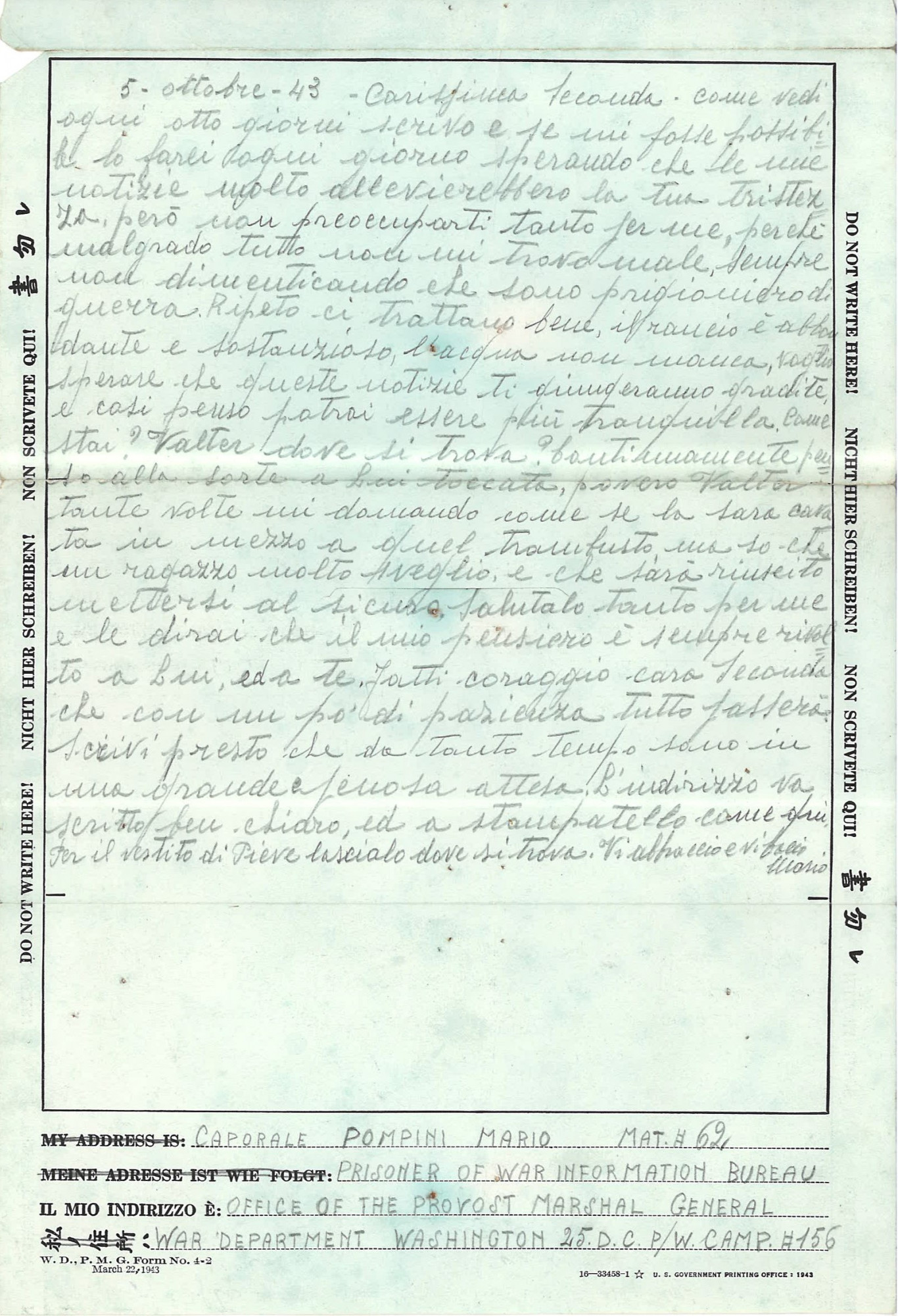 Lettera inviata alla moglie da Mario Pompini, dal campo 156 in Tunisia. Nel retro della sua scheda di iscrizione all'Anrp vi è una dichiarazione sottoscritta che racconta la sua esperieza di cooperante degli Alleati al seguito della 7° Armata america: catturato in Sicilia (Cassibile), internato in Tunisia, viene trasferito a Liverpool (Uk), in Francia (La Havre) per poi seguire l'avanza alleata in Belgio e infine in Germania.
